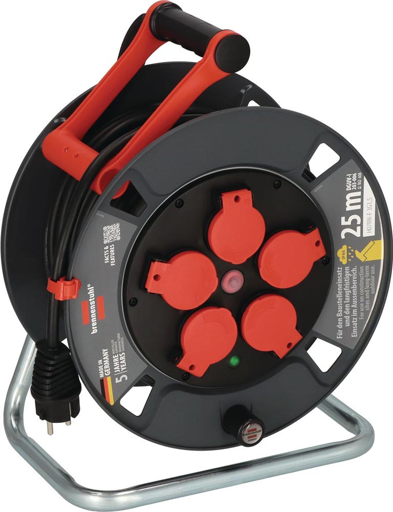 spritzwassergeschützt · aus Spezialkunststoff auf verzinktem Tragegestell · innovativer Tragegriff "cablepilot" für perfekte Kabelführung · pendelt auf beiden Seiten und ermöglicht bequemes Tragen und Aufhängen · mit Drehgriff für komfortables Aufrollen · 5 Schutzkontakt-Steckdosen mit selbstschließenden Deckeln · Überhitzungsschutz · Kontrollleuchten bei Überhitzung und Überlastung · Trommelbremse · nach DGUV 203-006 (ehem. BGI 608) · Gummi-Neoprenkabel H07RN-F
