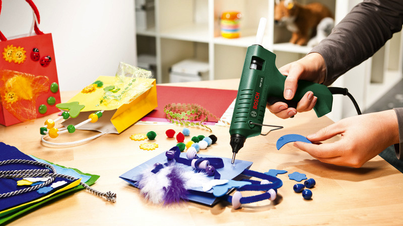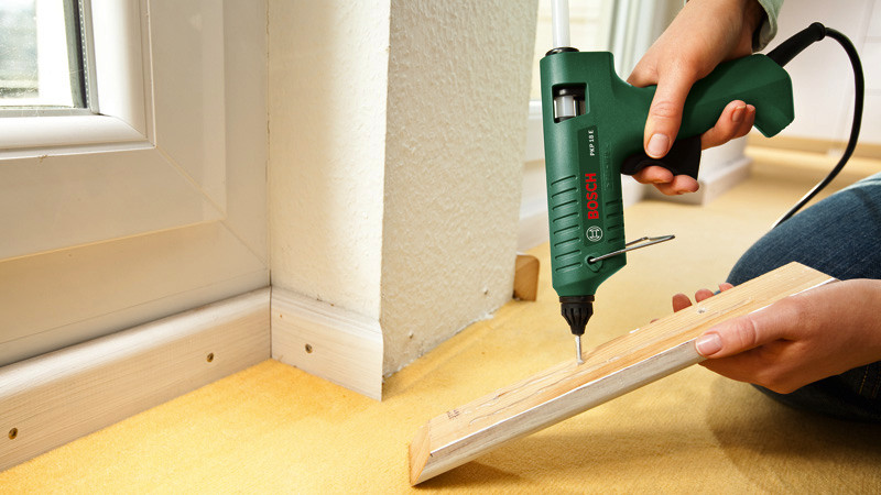 Klebepistole PKP 18 E. Fantastische Ergebnisse beim Kleben verschiedenster Materialien. Elektronische Heizelemente für ein schnelles Aufheizen und eine stabile Temperatur. Mechanischer Vorschub für ein exaktes Dosieren und gezieltes, zügiges Auftragen. Klebt Pappe, Glas, Fliesen, Holz, Stein, Textil, Kork, Kunststoff und vieles mehr. 1 extralange Düse (1 609 202 428). 1 Stick Schmelzkleber. Kartonschachtel
