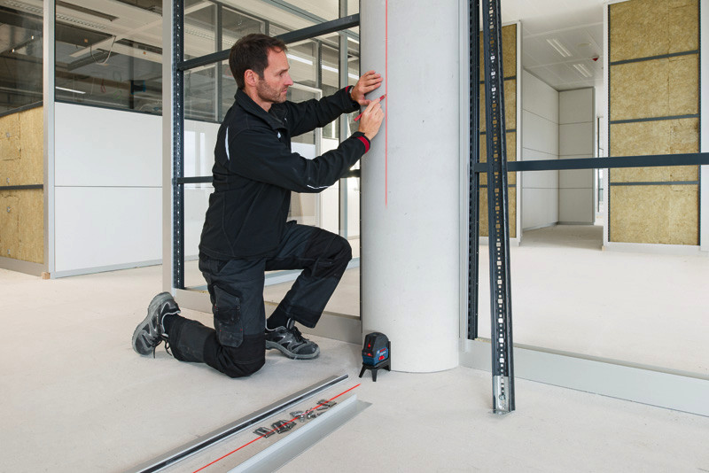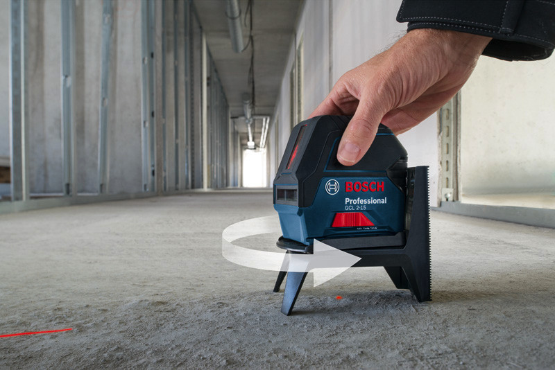 Kombilaser GCL 2-15, Der Kombilaser GCL 2-15 Professional überzeugt durch sein kompaktes Design und eignet sich besonders für Nivellierarbeiten auf kurze Distanz. Durch die Projektion von sowohl horizontalen als auch vertikalen Laserlinien und zwei zentrierten Lotpunkten lassen sich Nivellierarbeiten mit diesem Kombilaser schnell erledigen. Seine Lotpunkte ermöglichen schnelle und präzise Übertragungsanwendungen. Das Ausrichten der Laserlinien um die Lotpunkte ist dank seiner Drehhalterung RM 1 Professional einfach. Der GCL 2-15 Professional eignet sich für verschiedene Anwendungen wie die Montage von Regalen und Fenstern, Installation von Abflussrohren und Verlegung von Fußböden. Er bietet außerdem Punktübertragung zum Anbringen von Lampen. Der GCL 2-15 Professional hat einen Laserlinien-Arbeitsbereich von bis zu 15 m und nivelliert sich in weniger als 4 Sekunden selbst. Dieser Kombilaser eignet sich ideal für die Verwendung mit der Drehhalterung RM 1 Professional, die über einen einfachen Gleitmechanismus schnell angebracht werden kann. Dank Staub- und Spritzwasserschutz nach IP 54 ist er sehr robust. Beim Ausschalten des Geräts sorgt die Aktivierung der Pendelarretierung für einen sicheren Transport. Laserzieltafel. Schutztasche. Drehhalterung RM 1 Professional (0 601 092 600). 3 x 1,5 V-LR6-Batterie (AA)