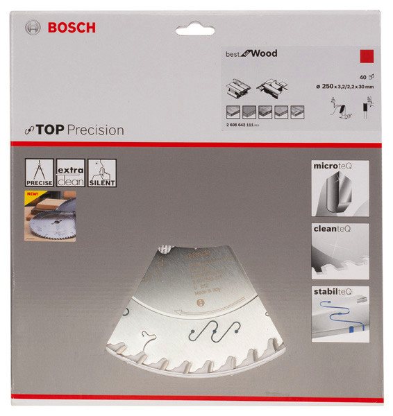 Das Best for Wood Kreissägeblatt bietet Industriequalität und ist ideal für höchst anspruchsvolle Anwendungen bei Holz. Die einzigartigen besonders harten Microteq-Zähne werden bei Bosch intern aus höchst robusten Carbide-Körnern produziert, um eine hohe Leistung sicherzustellen. Die hohe Qualität wird zudem durch die Cleanteq-Beschichtung verstärkt, die die Anhaftung von Rückständen, wie z. B. Harz und Klebstoff, reduziert, um besonders saubere Ergebnisse sicherzustellen. Die Beschichtung hält das Blatt kühl, um es vor Korrosion zu schützen. Polyurethangefüllte Dämpfungsschlitze: Vibrationen und Geräuschentwicklung werden stark verringert sowie die Schnittpräzision und der Arbeitskomfort verbessert. Das Sägeblatt ist für den Gebrauch mit Holzmaterialien aller Art konzipiert. Je nach Anzahl der Zähne können mit allen Best for Wood Kreissägeblättern, die eine ATB-Zahngeometrie (Wechselzahn) aufweisen, verschiedene Ergebnisse erzielt werden: mit einer hohen Zahnanzahl macht das Blatt saubere Schnitte, während wenige Zähne solide und effiziente Schnitte garantieren.