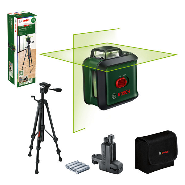 Kreuzlinien-Laser UniversalLevel 360 Premium-Set. Hochpräzise Nivellierung mit hervorragender Sichtbarkeit durch den gesamten Raum. Waagerechte 360°-Linie für genaues Ausrichten im ganzen Raum. Perfekt ausgerichtete senkrechte Linie für noch mehr Flexibilität. Grüne Laserlinien: bis zu viermal besser sichtbar, sogar bei hellen Lichtverhältnissen. Präzise, gut sichtbare Laserlinien mit einer Genauigkeit von +/- 0,4 mm/m, Selbstnivellierbereich. Perfekt für die Montage von Gardinenstangen, Steckdosen und abgehängten Decken. Produkt mit Nachhaltigkeitsmerkmalen, weitere Informationen siehe unten. Karton. Stativ TT 150 (0 603 691 101). Universalklemme MM 3 (0 603 962 301). Aufbewahrungshülle. 4 x Batterie 1,5V LR6 (AA)