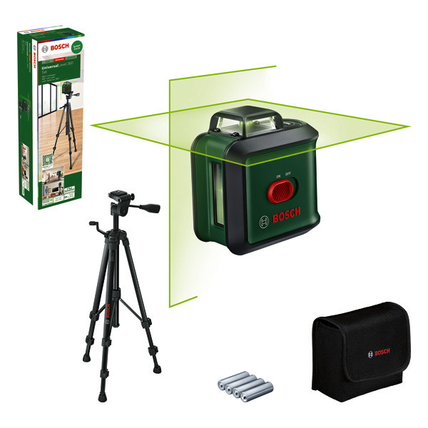 Kreuzlinien-Laser UniversalLevel 360 Set. Hochpräzise Nivellierung mit hervorragender Sichtbarkeit durch den gesamten Raum. Waagerechte 360°-Linie für genaues Ausrichten im ganzen Raum. Perfekt ausgerichtete senkrechte Linie für noch mehr Flexibilität. Grüne Laserlinien: bis zu viermal besser sichtbar, sogar bei hellen Lichtverhältnissen. Präzise, gut sichtbare Laserlinien mit einer Genauigkeit von +/- 0,4 mm/m, Selbstnivellierbereich. Perfekt für die Montage von Gardinenstangen, Steckdosen und abgehängten Decken. Produkt mit Nachhaltigkeitsmerkmalen, weitere Informationen siehe unten. Karton. Stativ TT 150 (0 603 691 101). Aufbewahrungshülle. 4 x Batterie 1,5V LR6 (AA)