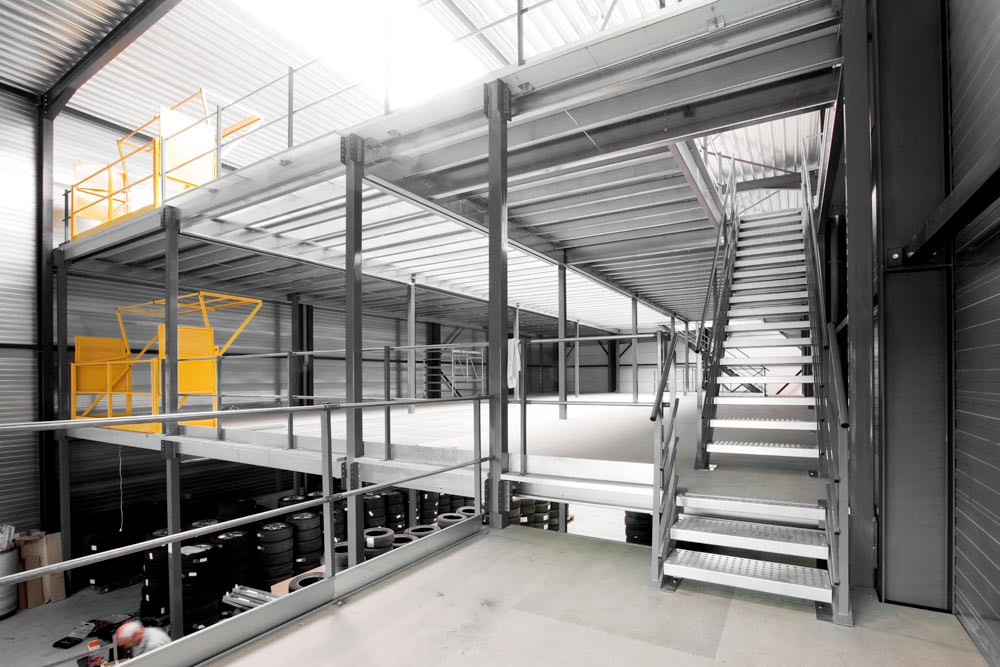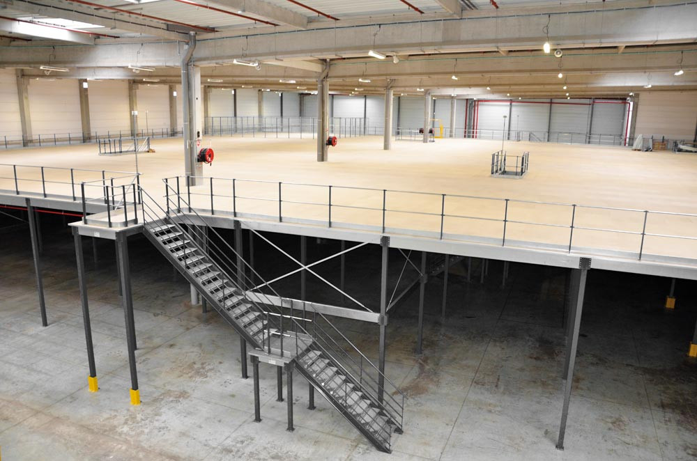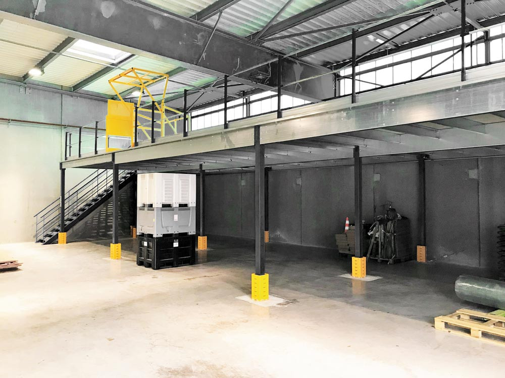 ∙ Hohe Stabilität und sicheres Befestigungssystem ∙ Alle Stahlteile sind hochwertig pulverbeschichtet ∙ Optional mit Treppe, Sicherheitsgeländer, Palettentür oder Palettenschleuse ∙ Belastung pro m2: 250-1000 kg (bei gleichmäßig verteilter Last) ∙ Festigkeitsberechnung entsprechend Eurocode 3 und gemäß FEM 10.2.02 TÜV-zertifiziert ∙ CE-zertifiziert nach europäischer Norm EU Nr. 305/2011 ∙ Treppe, Sicherheitsgeländer, Palettentür und Palettenschleuse gemäß EN ISO 14122-3 und NF E 85-015 (Verwendung nur im industriellen Bereich)