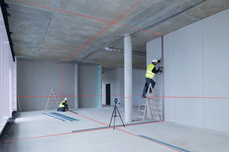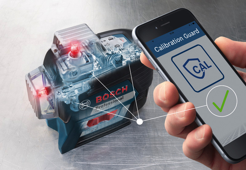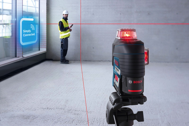 Linienlaser GLL 3-80 C, Der Linienlaser GLL 3-80 C Professional wird einfach angeschlossen und sorgt über die Projektion von 3 x 360°-Linien für exzellente Sichtbarkeit. Dank innovativer CAL Guard-Überwachung und Bluetooth®-Verbindung zur Smartphone-App sind der ferngesteuerte Einsatz, die kontaktlose Justierung sowie hohe Präzision möglich. Leistungsstarke Dioden garantieren starke Sichtbarkeit, während dank 3 x 360°-Linien für die gleichzeitige Durchführung von horizontalen und vertikalen Nivellierarbeiten und somit für hohe Arbeitseffizienz gesorgt wird. Dieser Linienlaser wurde für den Bau von Böden, die Montage von Fenstern, das Anbringen von Regalen, das Verlegen von Abflussrohren, den Rohbau für Trockenbauwände und das Verlegen von Fliesen entwickelt. Dank Dual Power Source-Technologie des GLL 3-80 C Professional ist ein Betrieb sowohl mit 12-V-Li-Ion-Akku als auch mit Standard-Alkalinebatterien möglich, ein Plus an Flexibilität. Das Gerät ist in der Lage, sich auf nicht planaren Oberflächen in weniger als 4 Sekunden mit einer exzellenten Genauigkeit von ± 0,2 mm/m*/** um bis zu +/- 4° selbst zu nivellieren und verfügt bei Verwendung des optionalen Empfängers LR 6 oder LR 7 Professional über eine Reichweite von bis zu 120 m. Dieser Linienlaser ist kompakt, einfach zu bedienen und extrem robust. Baustativ BT 150 Professional (0 601 096 B00). AA1 Alkaline Akku-Adapter (1 608 M00 C1B). Laserzieltafel. Tasche. 4 x 1,5 V-LR6-Batterie (AA)