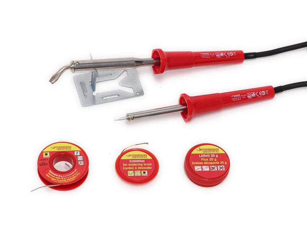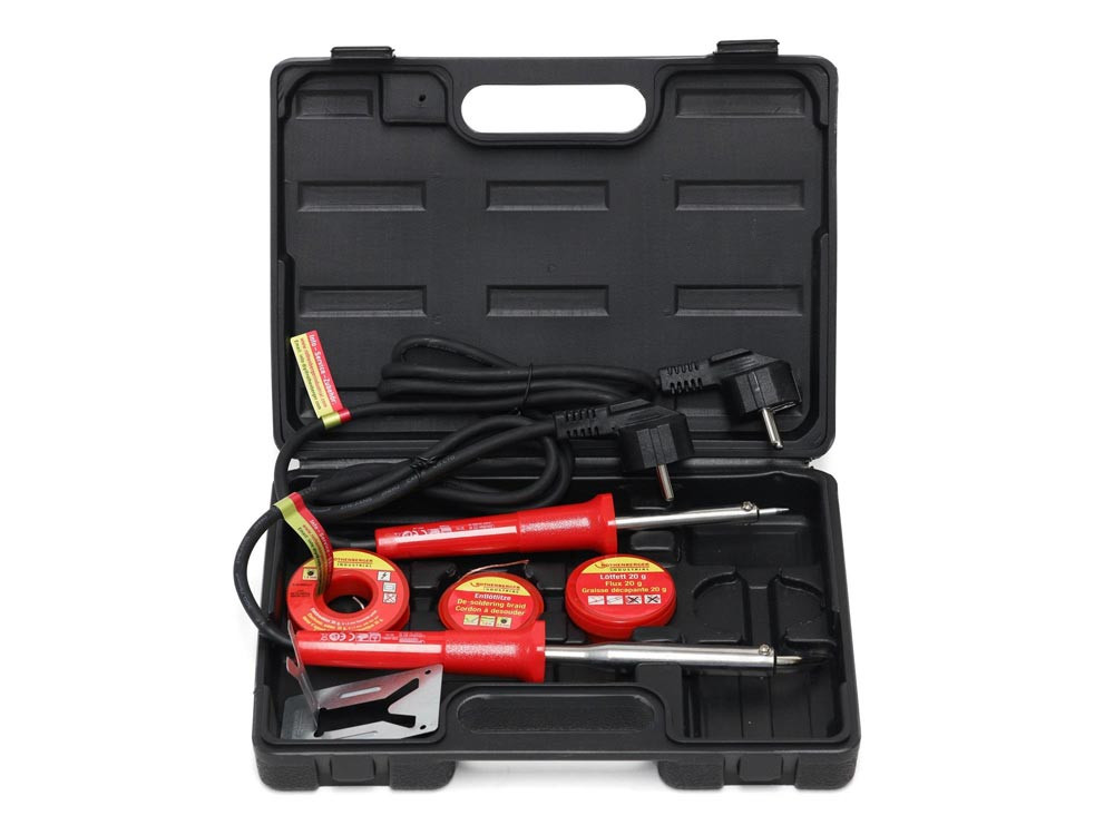 Lieferung: Lötkolben 25 W inkl. Lötspitze (gebogen/flach), Lötkolben 80 W inkl. Lötspitze (gerade/spitz), Lötfett 20 g, Entlötlitze 2,5 mm x 1,6 m, Elektroniklot 35 g
