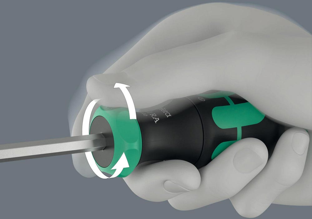 Kraftform Handhalter für 1/4″ Bits. Die im Griff integrierte Ratsche mit Feinverzahnung sorgt für schnelles Arbeiten. Das Umschalten der Schraubrichtung ist intuitiv: Wird der Ringschalter nach rechts gedreht · wird nach rechts geschraubt · wird der Ringschalter nach links gedreht · wird nach links geschraubt · für präzise Arbeiten kann die Ratschenmechanik mit der 0-Position deaktiviert werden · inklusive 6 zähharte Bits für den universellen Einsatz · untergebracht im Griff Integrierten Bit-Magazin · der starke Dauermagnet in der 1/4″ Bitaufnahme sorgt für sicheren Sitz des Bits · der 2-komponentige Kraftform Griff mit seiner Kombination aus Hart- und Weichzonen ermöglicht festes Zupacken und präzises Arbeiten