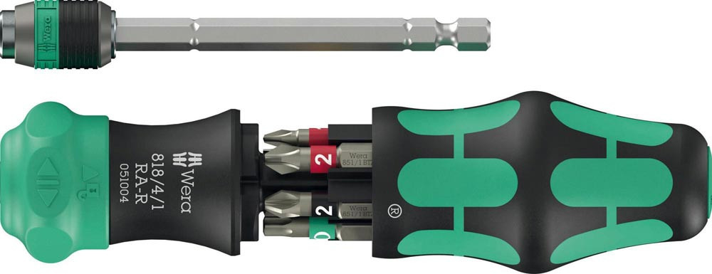 geeignet für Bits mit 1/4″-Außensechskantantrieb nach DIN ISO 1173-C 6,3 und E 6,3 und Wera Anschluss-Reihen 1 und 4 · im Griff integrierte Ratsche mit Feinverzahnung, intuitives Umschalten · für präzise Arbeiten kann die Ratschenmechanik mit der 0-Position deaktiviert werden · 1/4″-Innensechskantaufnahme, magnetisch · Verbindungsteil · Teleskopklinge · Rapidaptor-Technologie mit rapid-in, rapid-out, rapid-spin, chuck-all und single-hand-Funktion · 6 BiTorsion Bits für lange Lebensdauer, zähhart, für den universellen Einsatz · Take it easy Werkzeugfinder: Mit Abtrieb-Farbkennzeichung und Größenstempel für einfaches Finden des gewünschten Bits · Kraftform-Griff mit Abrollschutz, mehrkomponentig, integriertes Magazin