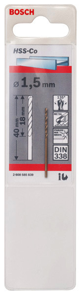 Metallbohrer HSS-Co, DIN 338, 1,5 x 18 x 40 mm, 1er-Pack