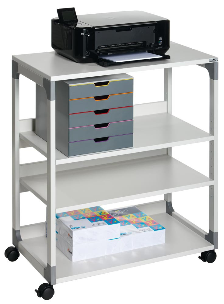· Aus stabilem, epoxidharzbeschichtetem Stahl mit glasfaserverstärkten Kunststoffecken · Melaminbeschichtete Böden, 19 mm stark · 4 Doppellaufrollen, davon 2 Rollen mit Feststeller · Traglast je Fachboden 30 kg