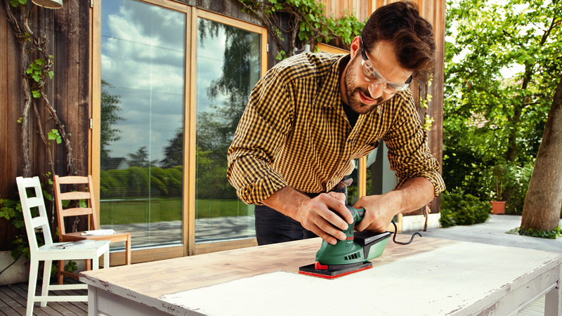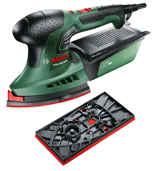 Multischleifer PSM 200 AES. Leistungsstarker Multischleifer mit Schleifplattenoptionen und Drehzahlregelung. Umfasst drei- und viereckige Schleifplatte für die Bewältigung verschiedenster Projekte. Einfacher und schneller Schleifvorsatzwechsel durch SDS-System. Elektronische Drehzahlvorwahl sorgt für die perfekte Drehzahl passend zu Arbeit und Material. Ideal zum Schleifen mittelgroßer und größerer flacher Oberflächen sowie von Ecken und Kanten. Für die Bearbeitung von Oberflächen aus Holz oder Metall sowie gestrichener und lasierter Oberflächen. Rechteckige Schleifplatte (2 609 256 D19). 1 Schleifpapier (bügeleisenform) K 80. 1 Schleifpapier (rechteckig) K 80. Kunststoffkoffer