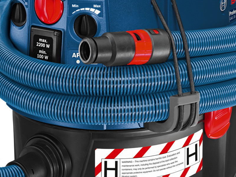 Nass-/Trockensauger GAS 35 H AFC, Der GAS 35 H AFC Professional ist der leistungsstarke Nass-/Trockensauger mit erhöhtem Anwenderschutz. Sein Sicherheitsfilter fängt 99,995 % von gesundheitsschädlichem Staub auf. Die Zertifizierung für Staubklasse H erhöht den Gesundheitsschutz gegen Krebs und andere Krankheiten erzeugende Stäube sowie organisches Material (z. B. Schimmel) und Behälterbaumaterial (z. B. Glasfaser). Seine automatische Filterreinigung verhindert Unterbrechungen für konstantes Arbeiten. Eine Volumenstromüberwachung kontrolliert den konstanten Luftstrom durch den Sauger und gibt ein akustisches Warnsignal, wenn der Luftstrom zu gering ist. Der GAS 35 H AFC Professional ist für die Staubklasse H (Krebs und andere Krankheiten erzeugenden Staub) zertifiziert. Die L-BOXX kann für einen einfachen Transport auf den Nass-/Trockensauger geklickt werden. Alle Bosch Elektrowerkzeuge mit dem Click & Clean System können ohne Adapter direkt mit dem GAS 35 H AFC Professional verbunden werden. Die leistungsstarke 1.380-W-Saugturbine mit einem Vakuumdruck von 254 mbar (Millibar) liefert gute Saugergebnisse. Der Nass-/Trockensauger ist mit antistatischen Elementen ausgestattet, um die elektrostatische Aufladung zu reduzieren. 1 x Flachfaltenfilter Klasse H (HEPA), PTFE (2 607 432 052). 1 x Sicherheitsfilterbeutel (separat als 5er-Pack erhältlich: 2 607 432 050). Schlauch 5 m, Ø 35 mm, antistatisch, mit Werkzeugmuffe (2 608 000 566). Fugendüse, 35 mm Ø (2 607 000 165). Krümmer (2 608 000 573). Bodendüsen-Set, 35 mm Ø (1 609 390 478). 3 x 0,35 m Saugrohr, verchromt, Ø 35 mm (2 608 000 575). 1 x PE-Einwegbeutel (separat als 10er-Pack erhältlich: 2 607 432 051)