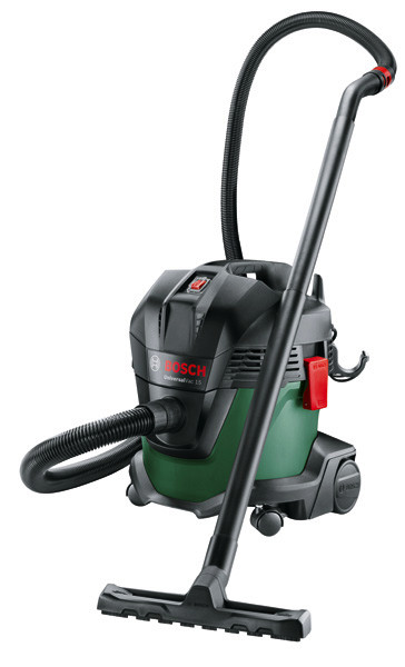 Nass- und Trockensauger UniversalVac 15. Einfaches Aufsaugen verschiedenster nasser und trockener Verschmutzungen. Bodendüse für eine universale Verwendung zum Beseitigen sowohl nasser als auch trockener Verschmutzungen. Sämtliches Zubehör wird für eine bequeme Aufbewahrung direkt am Sauger verstaut. Dank des integrierten Patronenfilters zum Nass- und Trockensaugen muss der Filter nicht gewechselt werden. Die Blasfunktion ist ideal zum Entfernen von Laub und Schmutz in schwer zugänglichen Bereichen. Papierfilterbeutel (2 609 256 F32). ** Nachkauf nur im 5er-Set. Vorfilter (2 609 256 F41). Filter (2 609 256 F35). Fugendüse (2 609 256 F26). Haltegriff (2 609 256 F31). 2 Saugrohre zu jeweils 0,5 m, Ø 35 mm (2 609 256 F27). Bodendüse (2 609 256 F21). Gummilippe / Bürsteneinsatz (2 609 256 F23). Schlauch 2,2 m, Ø 35 mm (2 609 256 F29). Universaladapter (2 609 256 F28). Karton