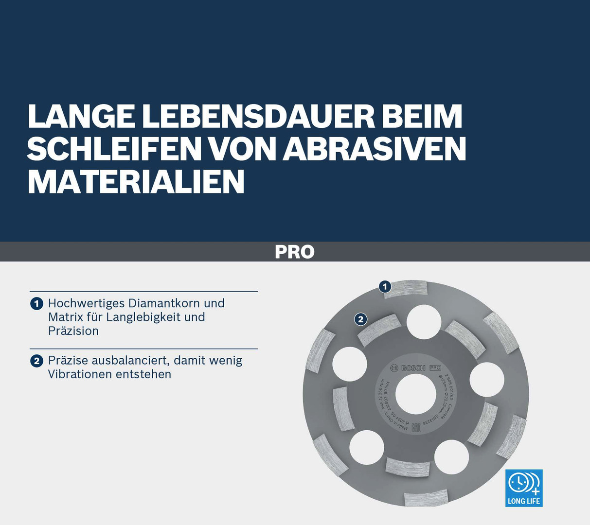 Lange Lebensdauer beim Schleifen von abrasiven Materialien! Hochwertiges Diamantkorn und Matrix für Langlebigkeit und Präzision Bauarbeiter müssen häufig große Ziegelsteine und andere abrasive Oberflächen schleifen. Mit der speziellen PRO Abrasive Topfscheibe bekommst du ein Zubehör an die Hand, das effektiv arbeitet und lange hält.