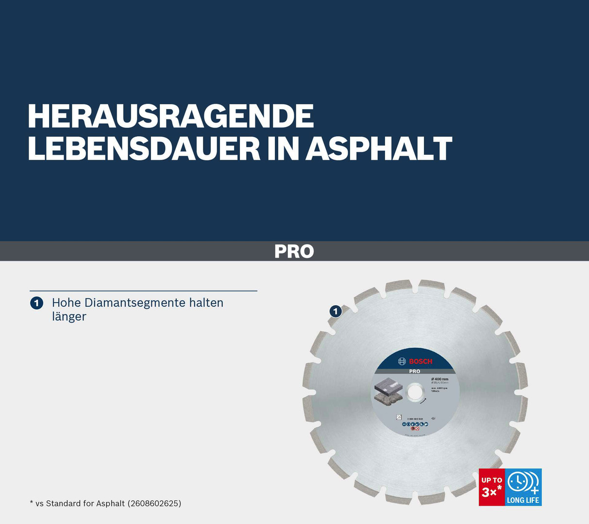 Herausragende Lebensdauer in Asphalt! Hohe Diamantsegmente halten länger Wenn du Asphalt schneiden musst, handelt es sich häufig um große Flächen. Dafür benötigst du eine spezielle Trennscheibe. Wir haben die PRO Asphalt entwickelt, die für einen besseren Schnitt und eine längere Lebensdauer sorgt.