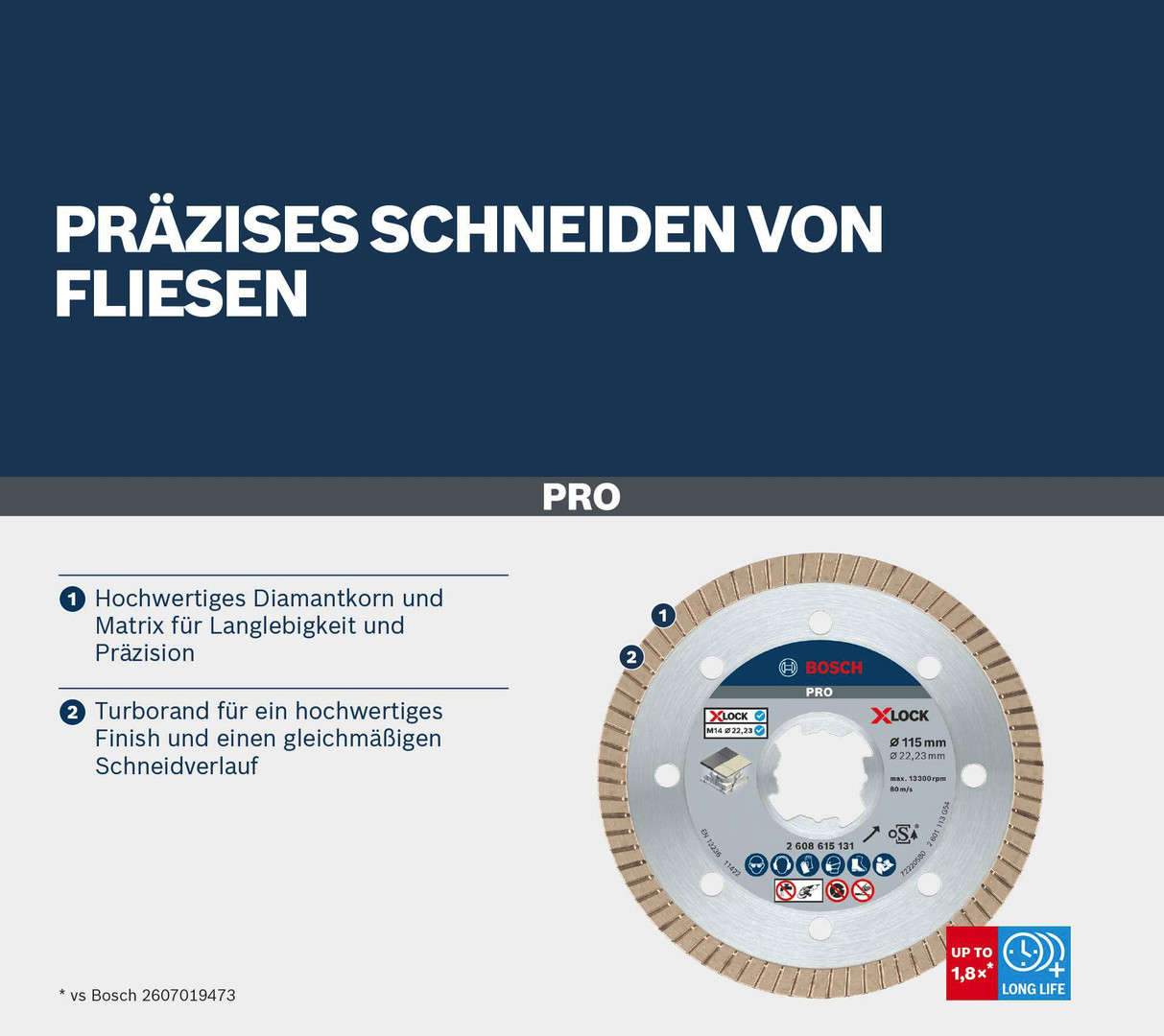 Präzises Schneiden von Fliesen! Hochwertiges Diamantkorn und Matrix für Langlebigkeit und Präzision Beim Schneiden von Fliesen ist Qualität das A und O: Eine gute, spezielle Diamanttrennscheibe wie die PRO Ceramic bietet Profis glatte Schnitte bei minimaler Splitterbildung für weniger Abfall und hervorragende Arbeitsergebnisse.