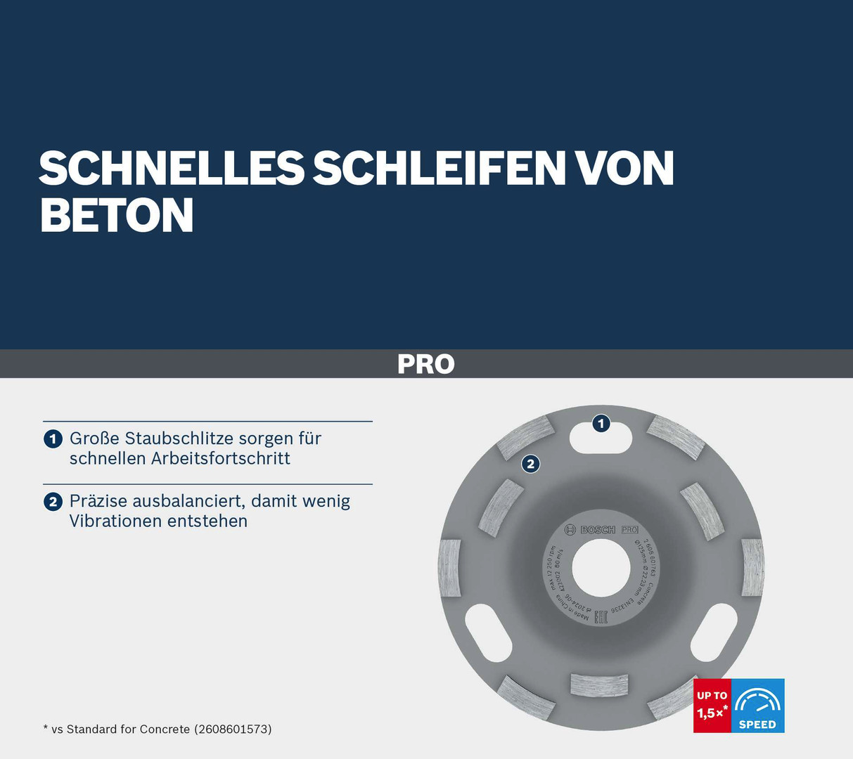 Schnelles Schleifen von Beton! Große Staubschlitze sorgen für schnellen Arbeitsfortschritt In modernen Wohn- und Gewerbegebäuden sind häufig glatte Betonoberflächen zu finden. Und um das perfekte Endergebnis zu erzielen, benötigst du eine effektive Topfscheibe. Der PRO Concrete Topfscheibe wurde entwickelt, damit du große Betonoberflächen schnell schleifen kannst.