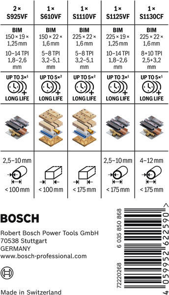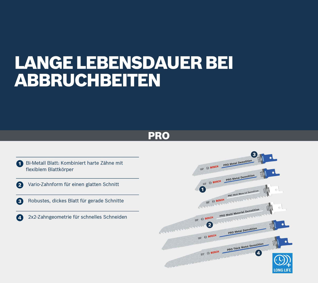 Lange Lebensdauer bei Abbruchbeiten! Bi-Metall Blatt: Kombiniert harte Zähne mit flexiblem Blattkörper Säbelsägen sind ausgezeichnete Werkzeuge für Abbrucharbeiten. Dieses PRO Demolition Set enthält ausgewählte Bosch PRO Blätter, mit denen du anspruchsvolle Abbrucharbeiten durchführen kannst.