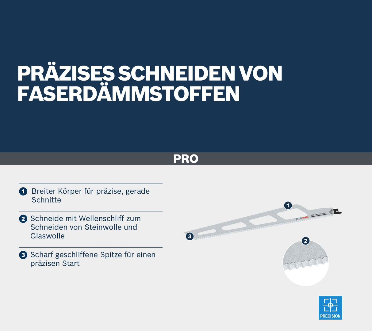 Präzises Schneiden von Faserdämmstoffen! Breiter Körper für präzise, gerade Schnitte Profis, die mit dicken Faserdämmstoffen wie Steinwolle und Glaswolle arbeiten, müssen Abschnitte auf die richtige Größe zuschneiden. Damit die Dämmung funktioniert, ist oft eine gewisse Präzision erforderlich. Das PRO Fibre Insulation S2013AWP Säbelsägeblatt wurde speziell für diese Aufgabe entwickelt.
