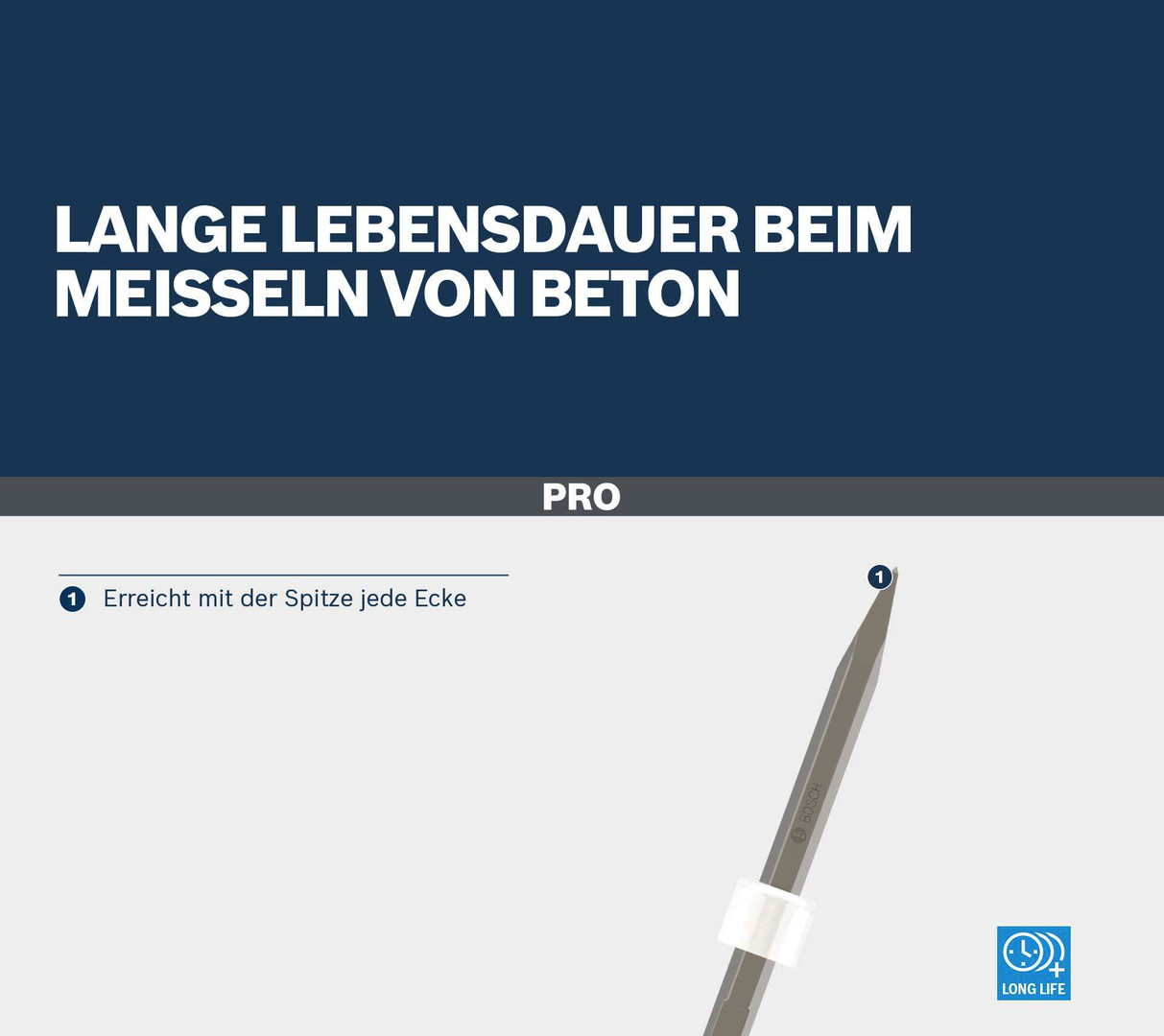 Lange Lebensdauer beim Meißeln von Beton! Erreicht mit der Spitze jede Ecke Du suchst einen langlebigen Meißel, um Beton und Ziegel mit deinem Bohrhammer aufzubrechen? Dann ist der PRO HEX 19-4C Spitzmeißel die richtige Wahl. Wir haben ihn so konzipiert, dass du leichtere Präzisionsmeißelarbeiten effektiv und ohne Unterbrechungen erledigen kannst.