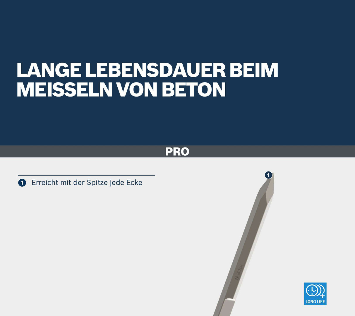 Lange Lebensdauer beim Meißeln von Beton! Erreicht mit der Spitze jede Ecke Du suchst einen langlebigen Meißel, um Beton und Ziegel mit deinem Bohrhammer aufzubrechen? Dann ist der PRO HEX 28-4C die richtige Wahl. Wir haben ihn so konzipiert, dass du leichtere Präzisionsmeißelarbeiten effektiv und ohne Unterbrechungen erledigen kannst.