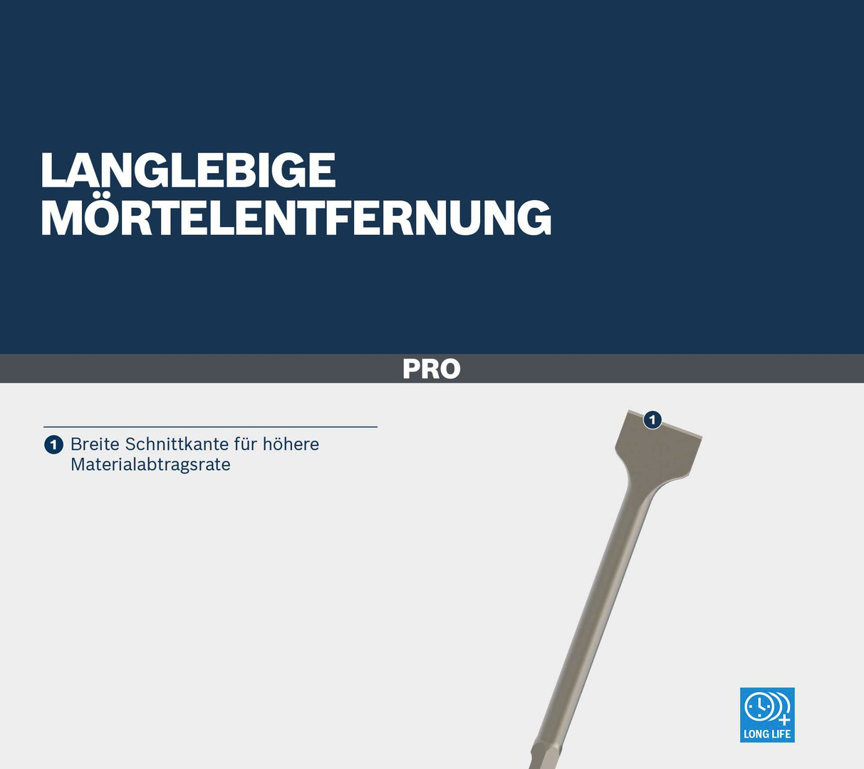 Langlebige Mörtelentfernung! Breite Schnittkante für höhere Materialabtragsrate Bist du Renovierer von Innenräumen und benötigst einen langlebigen Meißel, um Mörtel und Putz von Wänden und Böden zu entfernen? Wir haben den PRO HEX 30-4C entwickelt, damit du die Arbeit zuverlässig erledigen kannst.