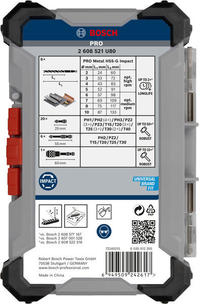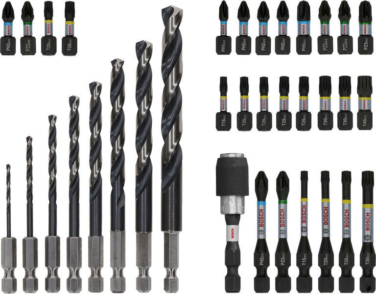 Robustes Eindrehen von Schrauben und langlebiges Bohren in Metall! Die verlängerte Torsionszone nimmt die Drehmomentbelastung an der Spitze des Schrauberbits auf Benötigst du ein Set starker Schrauberbits und Metallbohrer, um deine Innenausbauarbeiten zu erledigen? Dann ist das PRO Impact Metal die richtige Wahl. Die Schrauberbits wurden aus modifiziertem Stahl für eine höhere Stabilität hergestellt. Durch die Lasermarkierungen kannst du den benötigten Bit im Handumdrehen auswählen. Die Bohrer bestehen aus HSS-G-Material, damit du Metall problemlos bearbeiten kannst.