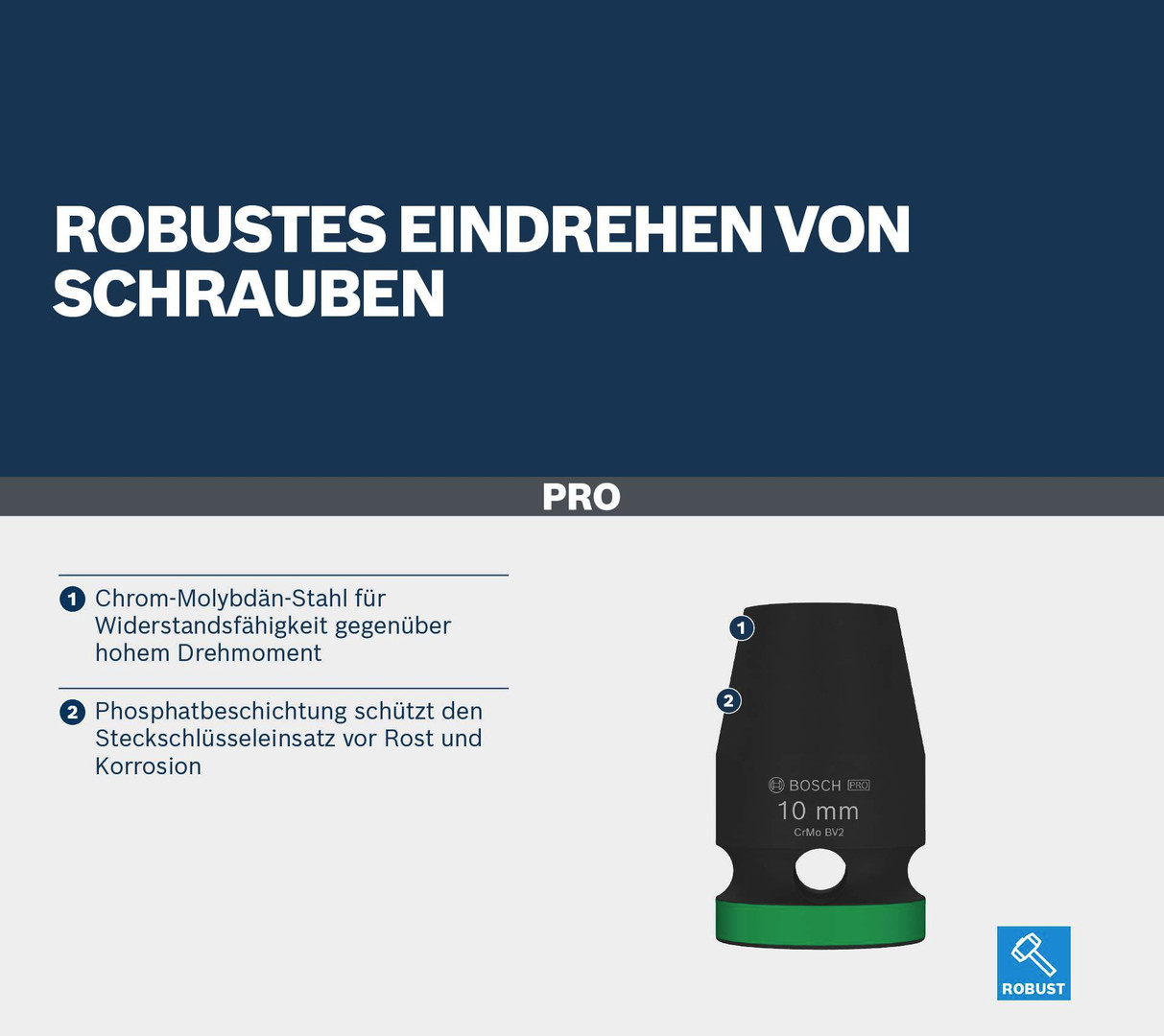 Robustes Eindrehen von Schrauben! Chrom-Molybdän-Stahl für Widerstandsfähigkeit gegenüber hohem Drehmoment Du kannst den PRO Impact Steckschlüsseleinsatz für Sechskantschrauben, Bolzen und Muttern mit deinem Schraubenschlüssel mit Vierkantantrieb verwenden. Wir haben es für Schraubarbeiten bei umfangreichen Montagen oder andere anspruchsvolle Industriearbeiten entwickelt.