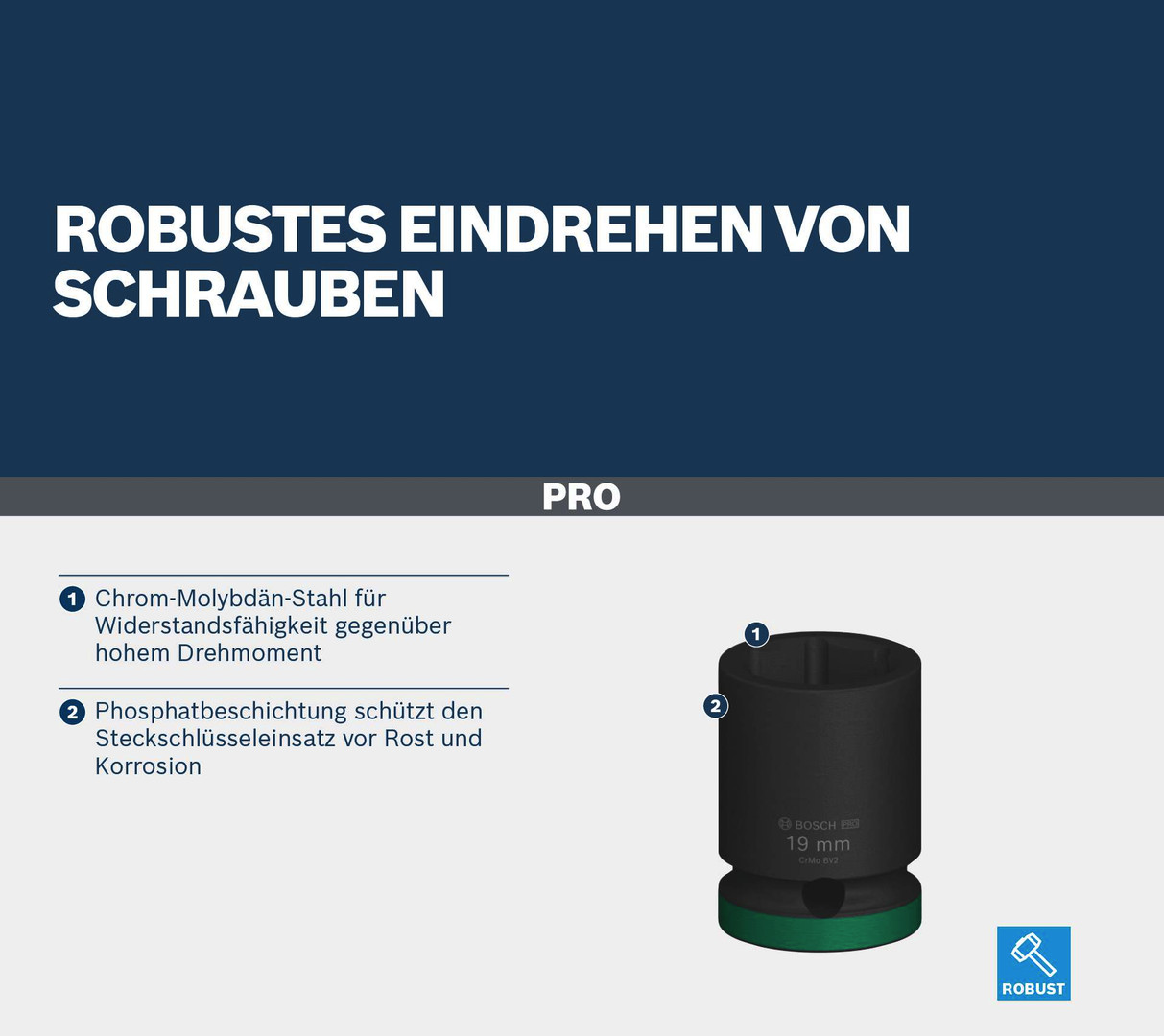 Robustes Eindrehen von Schrauben! Chrom-Molybdän-Stahl für Widerstandsfähigkeit gegenüber hohem Drehmoment Du kannst das PRO Impact Steckschlüsseleinsatz-Set für Sechskantschrauben, Bolzen und Muttern mit deinem Schraubenschlüssel mit Vierkantantrieb verwenden. Wir haben es für Schraubarbeiten bei umfangreichen Montagen oder andere anspruchsvolle Industriearbeiten entwickelt.