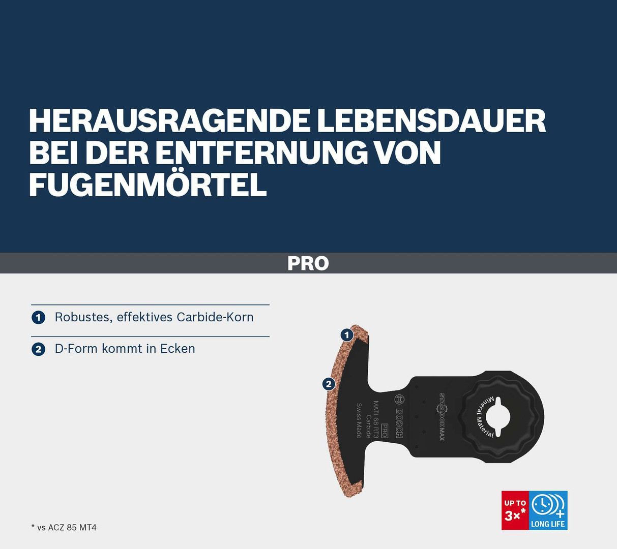 Herausragende Lebensdauer bei der Entfernung von Fugenmörtel! Robustes, effektives Carbide-Korn Multifunktionswerkzeuge eignen sich hervorragend zum Entfernen von altem Fugenmörtel, ohne die umliegenden Fliesen zu beschädigen. Das PRO MATI 68 RT3 erledigt dies extrem effizient und bietet eine lange Produktlebensdauer. Es ist damit auch möglich, Kabelkanäle in Porenbeton zu schneiden.