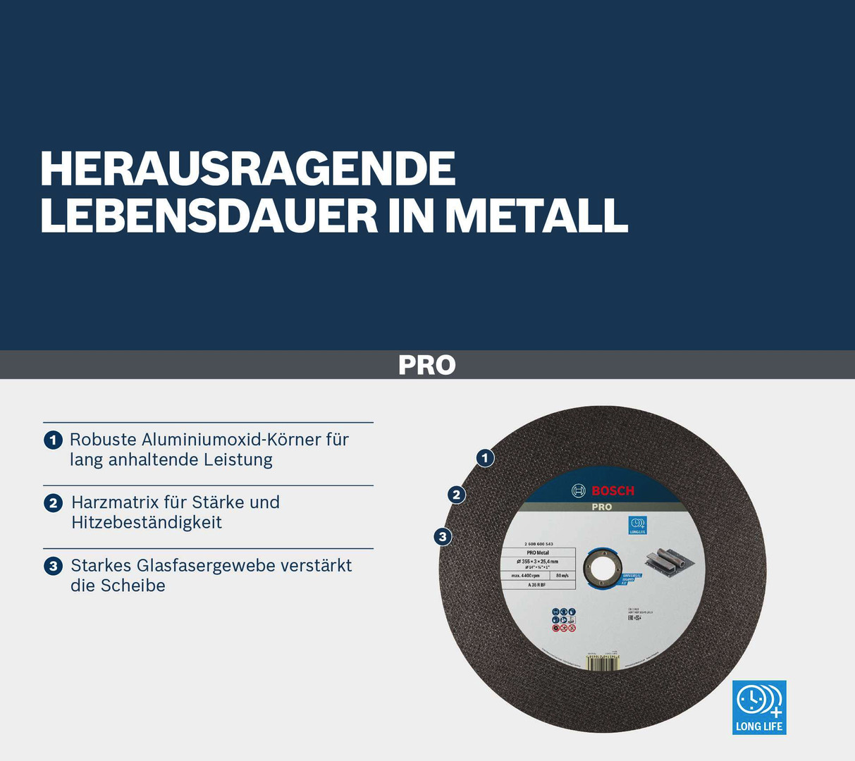 Herausragende Lebensdauer in Metall! Robuste Aluminiumoxid-Körner für lang anhaltende Leistung Bist du Metallarbeiter und suchst eine langlebige, größere Trennscheibe, die du mit deiner Kappsäge verwenden kannst? Dann ist die PRO Metal die richtige Wahl. Wir haben sie mit hochwertigen Schleifkörnern versehen, um Stabilität und Haltbarkeit zu gewährleisten.