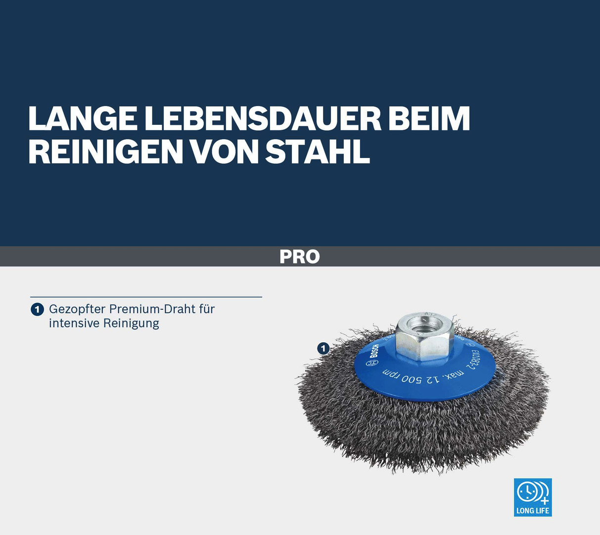 Lange Lebensdauer beim Reinigen von Stahl! Gezopfter Premium-Draht für intensive Reinigung Standard-Topfbürsten eignen sich gut für größere Flächen, sind jedoch nicht immer die beste Wahl, wenn du ein Werkstück mit schwer zugänglichen Stellen reinigen musst. Die langlebige PRO Metal clean Kegelbürste hat eine schräge Form, damit du leichter an engere Stellen gelangst.