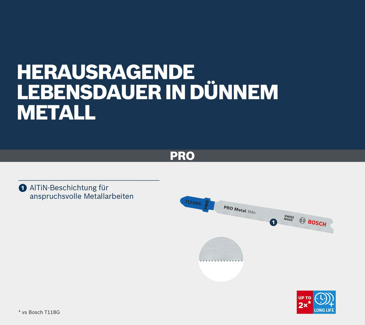 Herausragende Lebensdauer in dünnem Metall! AlTiN-Beschichtung für anspruchsvolle Metallarbeiten Bist du Metallarbeiter und suchst ein starkes und langlebiges Stichsägeblatt zum Schneiden dünner Metallbleche? Dann ist das PRO Metal thin T121GFC die richtige Wahl. Wir haben die Zähne mit einer Beschichtung verstärkt, um sicherzustellen, dass sie Hitze und Oxidation widerstehen. Damit kannst du gerade Schnitte in dünnem Blech erzielen immer und immer wieder.