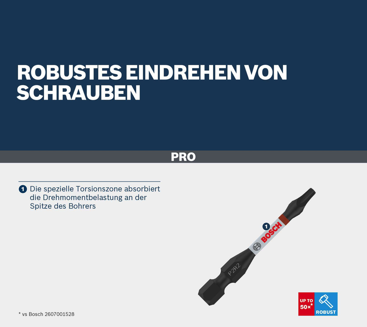 Robustes Eindrehen von Schrauben! Die verlängerte Torsionszone nimmt die Drehmomentbelastung an der Spitze des Schrauberbits auf Benötigst du Kreuzschlitz 2- oder Robertson 2-Schrauberbits für das Eindrehen von Schrauben? Bits, die lange halten und bei anspruchsvollen Anwendungen gut funktionieren? Probiere PRO Impact P2R2. Sie sind auf Stärke und Widerstandsfähigkeit gegenüber hohem Drehmoment ausgelegt.