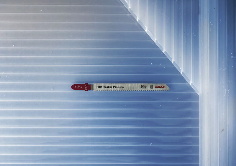 Präzises Schneiden von Kunststoffen! Konisch geschliffener Blattkörper für feine, saubere Schnitte Das Schneiden von thermoplastischen Materialien wie Polycarbonat (PC) verlangt nach einem scharfen Blatt, das die Hitze reduziert und verhindert, dass das Material schmilzt. Wir haben das PRO Plastics PC clean T101A Stichsägeblatt entwickelt, damit du PC-Blätter sauber und einfach schneiden kannst.