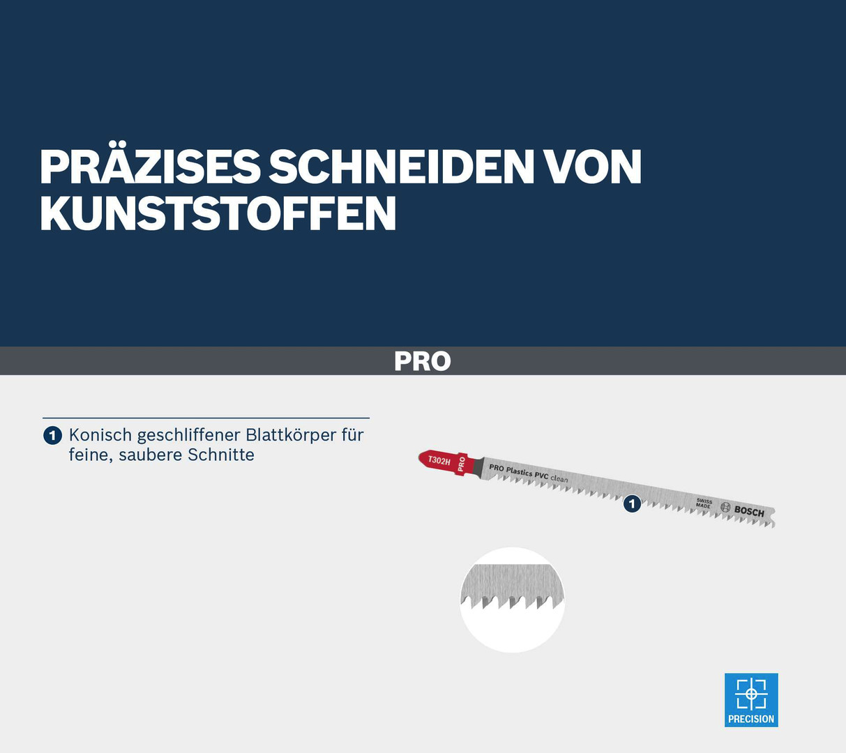 Präzises Schneiden von Kunststoffen! Konisch geschliffener Blattkörper für feine, saubere Schnitte Zum Schneiden von thermoplastischem Material ist ein scharfes und effizientes Stichsägeblatt erforderlich, das die Wärmeentwicklung reduziert und ein Schmelzen des Materials verhindert. Wir haben das PRO Plastics PVC and PMMA clean T302H entwickelt, um saubere Schnitte in thermoplastischen Platten, Rohren und Profilen zu ermöglichen.