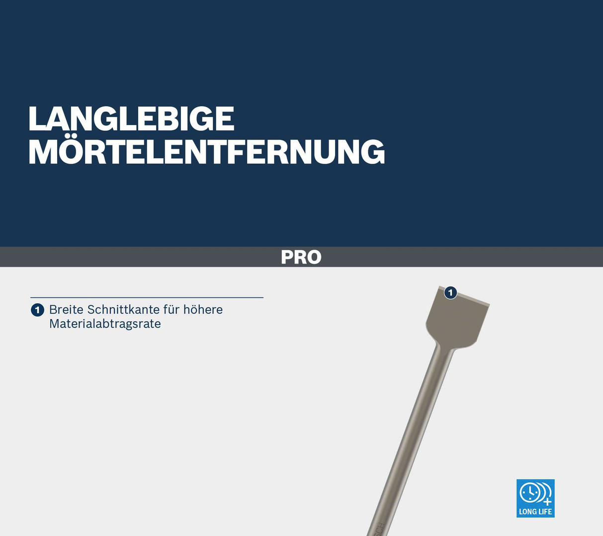 Langlebige Mörtelentfernung! Breite Schnittkante für höhere Materialabtragsrate Bist du Renovierer von Innenräumen und benötigst einen langlebigen Meißel, um Mörtel und Putz von Wänden und Böden zu entfernen? Wir haben den PRO SDS max-4C entwickelt, damit du die Arbeit zuverlässig erledigen kannst.