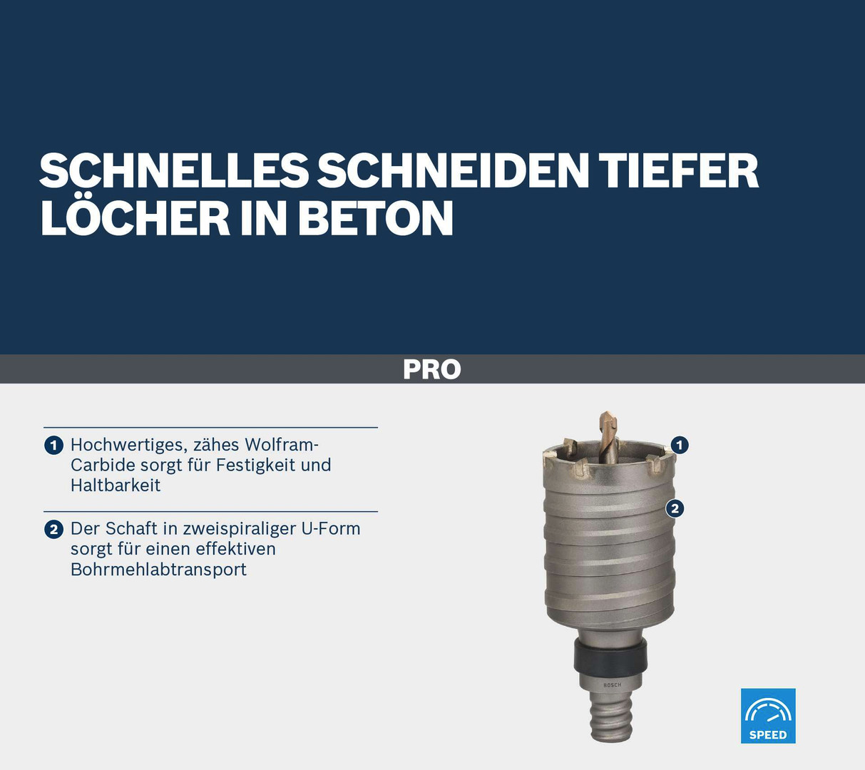 Schnelles Schneiden tiefer Löcher in Beton! Hochwertiges, zähes Wolfram-Carbide sorgt für Festigkeit und Haltbarkeit Das Schneiden tiefer Löcher für Rohre und Schaltkästen in Beton, Ziegel und Kalkstein kann eine schwierige und zeitaufwändige Arbeit sein. Der PRO SDS max-5 Core Cutter ist die Lösung. Er wurde für Elektriker, Sanitärinstallateure und Heizungs- und Klimaanlagen-Monteure entwickelt, die tiefe Löcher schneller und einfacher schneiden möchten.