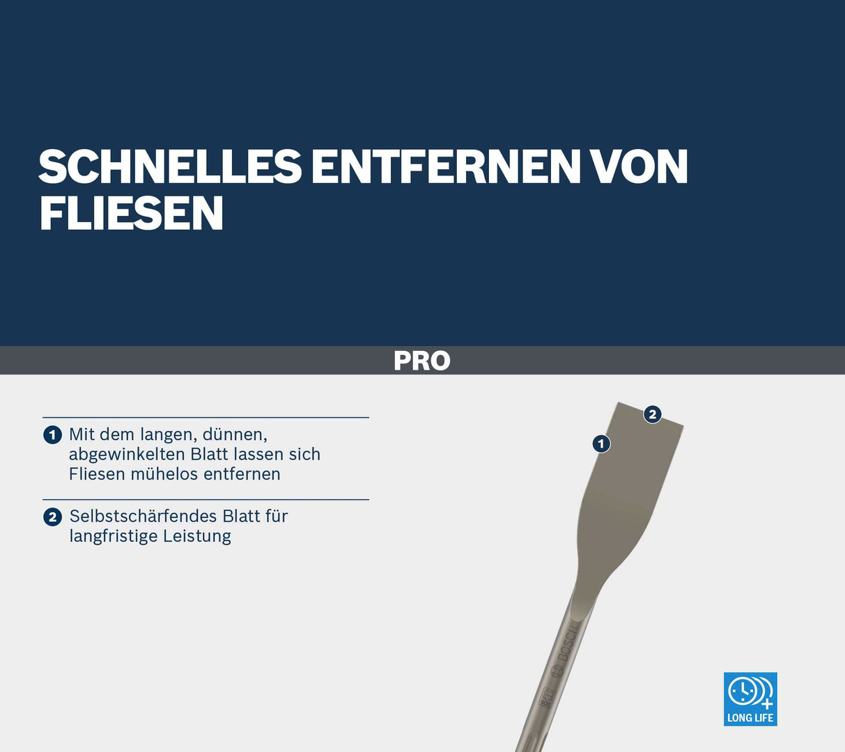 Schnelles Entfernen von Fliesen! Mit dem langen, dünnen, abgewinkelten Blatt lassen sich Fliesen mühelos entfernen Renovierer müssen Fliesen entfernen können, ohne sie zu zerbrechen. Der PRO SDS max-5C Fliesenmeißel ist mit einer langen, abgewinkelte Klinge ausgestattet, damit du Wand- und Bodenfliesen sauber und effizient entfernen kannst.