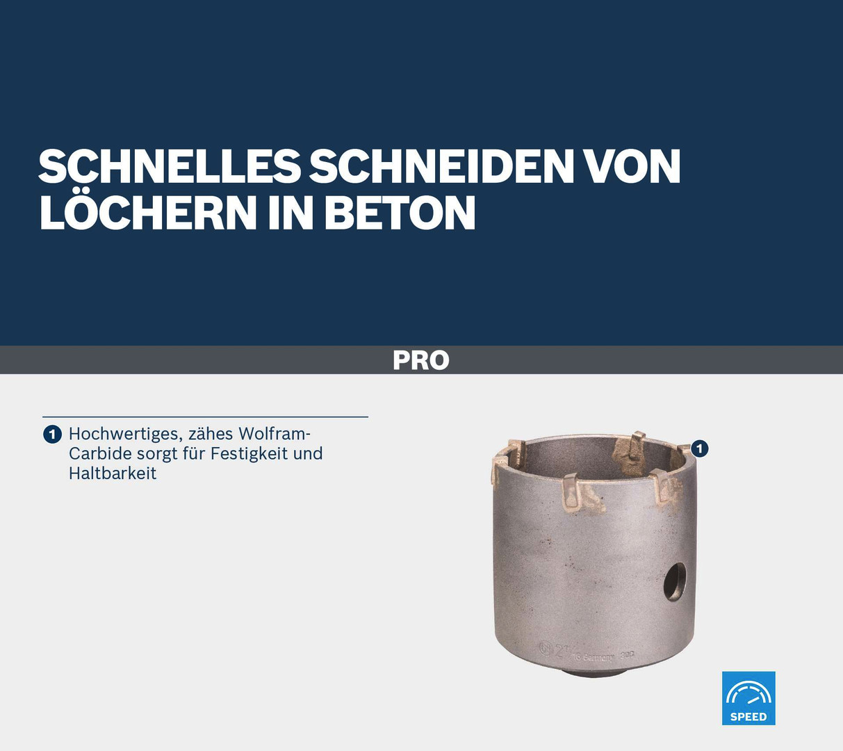 Schnelles Schneiden von Löchern in Beton! Hochwertiges, zähes Wolfram-Carbide sorgt für Festigkeit und Haltbarkeit Das Schneiden von Löchern für Rohre und Schaltkästen in Beton, Ziegel und Kalkstein kann eine zeitaufwändige Arbeit sein. Der PRO SDS plus-5 Core Cutter bietet die Lösung. Er wurde für Elektriker, Sanitärinstallateure und Heizungs- und Klimaanlagen-Monteure entwickelt, die Löcher schneller schneiden möchten.