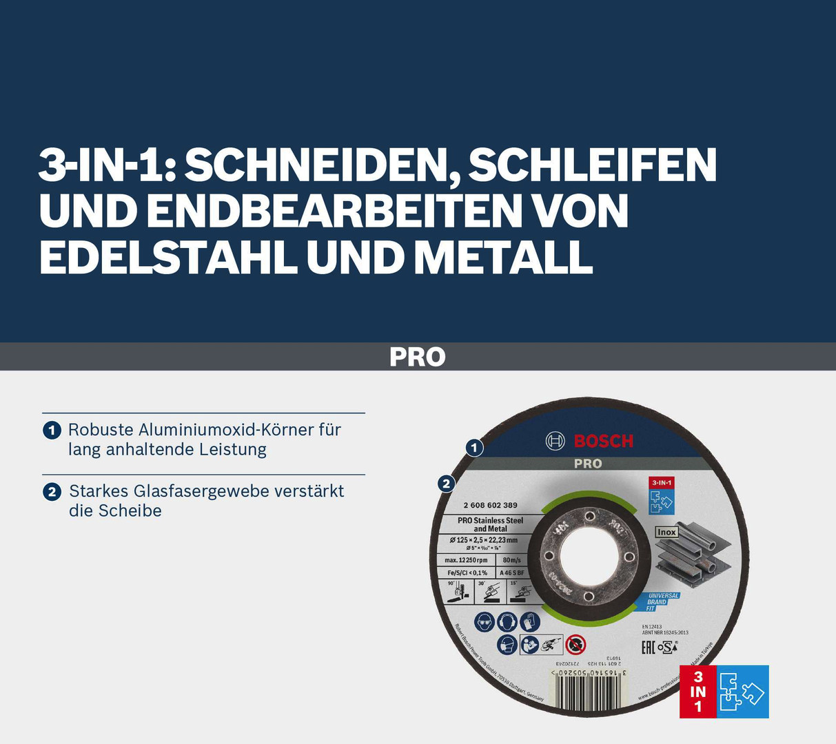 PRO Stainless Steel and Metal Gebundene 3-in-1-Disc, 115 x 2,5 x 22,23 mm