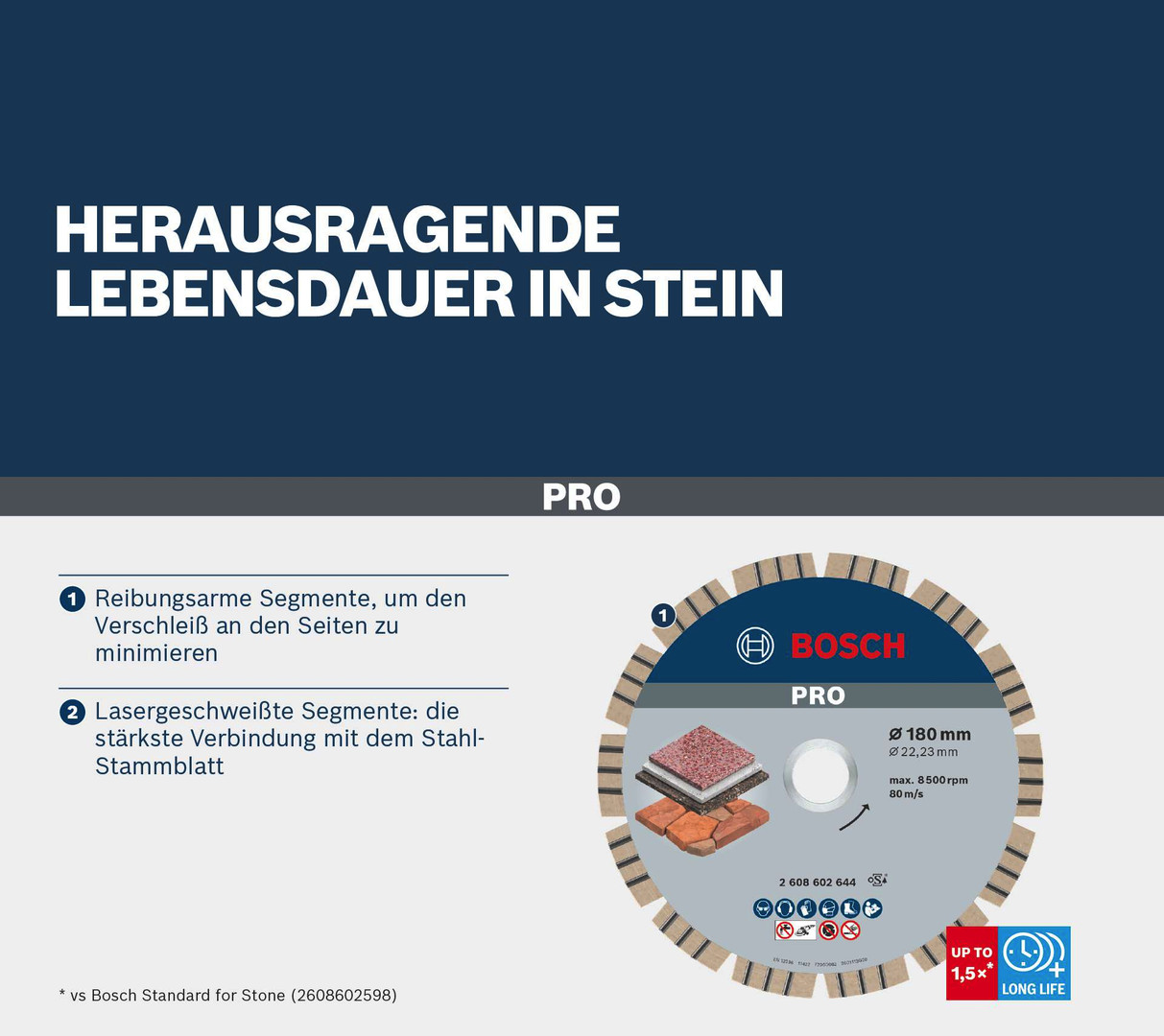 Herausragende Lebensdauer in Stein! Reibungsarme Segmente, um den Verschleiß an den Seiten zu minimieren Diamant-Trennscheiben haben die Arbeit mit Stein einfacher gemacht als früher. Ein guter Baustein ist jedoch eine Herausforderung für dein Zubehör. Maurer, die heute mit Stein arbeiten, profitieren von der PRO Stone, einer Diamant-Trennscheibe mit hervorragender Lebensdauer und ausgezeichneter Schnittleistung.