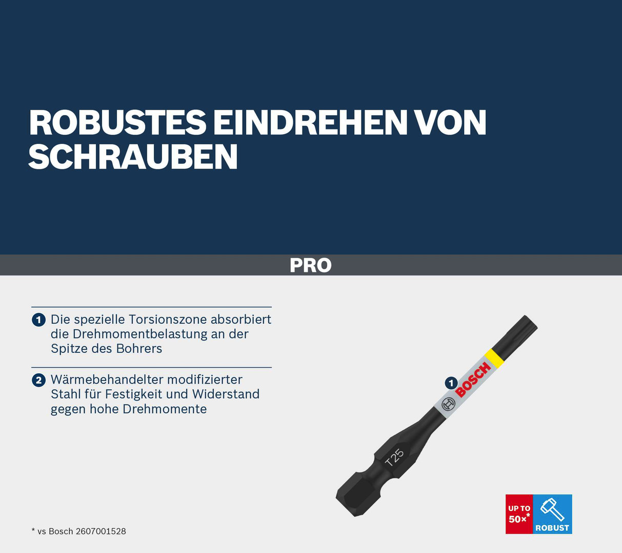 Robustes Eindrehen von Schrauben! Die verlängerte Torsionszone nimmt die Drehmomentbelastung an der Spitze des Schrauberbits auf Benötigst du Torx-Schrauberbits für das Eindrehen von Schrauben? Bits, die lange halten und bei anspruchsvollen Anwendungen gut funktionieren? Probiere PRO Impact T. Wir haben sie für Stärke und Widerstandsfähigkeit gegen hohe Drehmomente entwickelt.