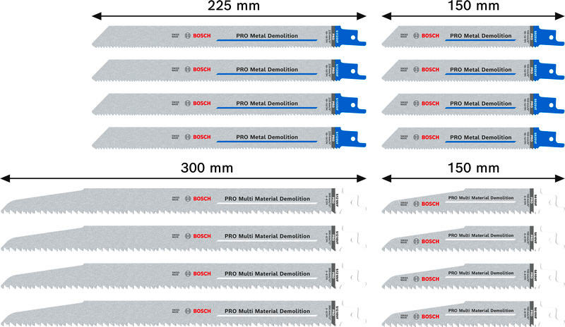 Lange Lebensdauer bei Abbrucharbeiten und gute Blatthandhabung! Bi-Metall Blatt: Kombiniert harte Zähne mit flexiblem Blattkörper Säbelsägen sind ausgezeichnete Werkzeuge für Abbrucharbeiten. Dieses PRO Demolition Set enthält ausgewählte Bosch PRO Blätter, mit denen du anspruchsvolle Abbrucharbeiten durchführen kannst.