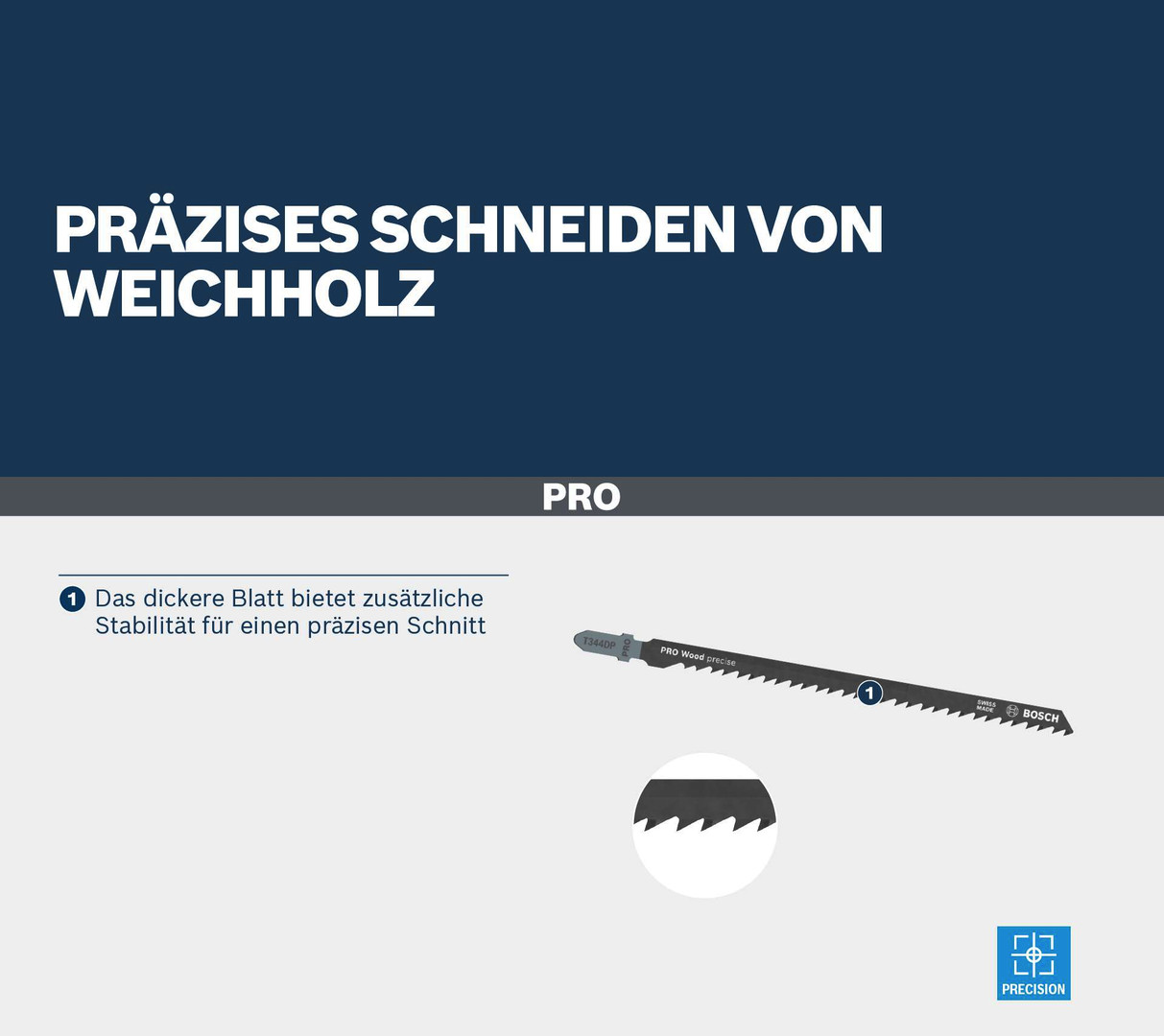 Präzises Schneiden von Weichholz! Das dickere Blatt bietet zusätzliche Stabilität für einen präzisen Schnitt Für schnelle, gerade Schnitte in dickeren Werkstücken aus Weichholz ist ein Sägeblatt mit hoher Winkelgenauigkeit erforderlich. Das Blatt muss dicker, länger und mit starken, scharfen Zähnen ausgestattet sein. Das PRO Wood precise T344DP Stichsägeblatt bietet alles, was du für diese Arbeit benötigst.