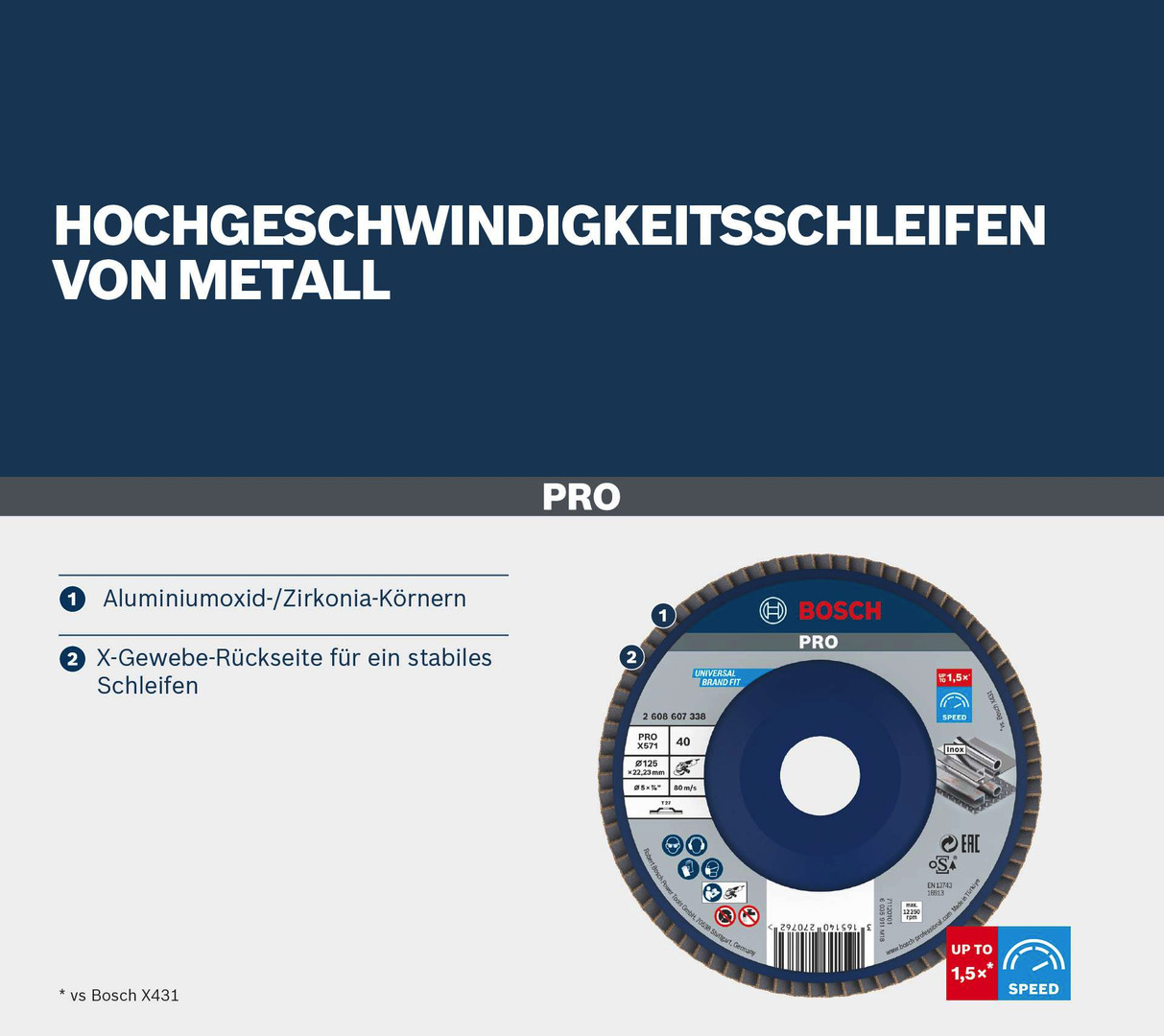 Hochgeschwindigkeitsschleifen von Metall! Aluminiumoxid-/Zirkonia-Körnern Fächerschleifscheiben bieten eine großartige Kombination aus Haltbarkeit und schnellem Materialabtrag und diese PRO X571 ist sogar noch schneller als die meisten anderen.