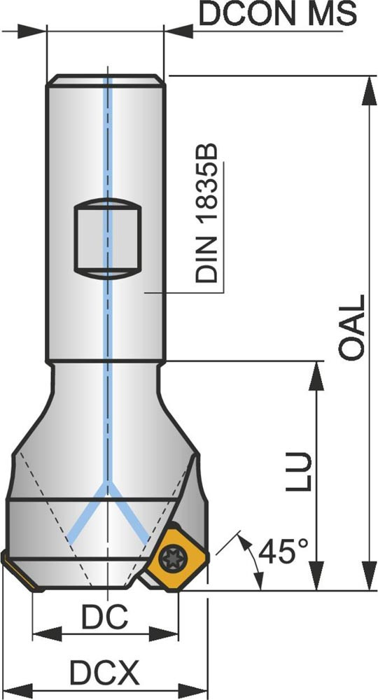 Planfräser mit positiver/negativer Geometrie zum spannen von 4 Stück SEET 09T3AF.. oder SEMT 09T3AF.. einseitigen Wendeschneidplatten · Schnittdurchmesser 32 bis maximal 42.0mm mit 45° Anstellwinkel und 32mm Weldon Schaft gemäß DIN 1835B · 102mm Gesamtlänge · Kühlkanalbohrung zum Planfräsen und Entgratfräsen mit einer maximalen Schnitttiefe von 4.5mm
