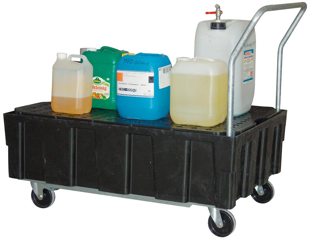 Polyethylen-Auffangwanne mit 2 Lenk- und 2 Bockrollen, mit verzinktem Stahlgitterrost, BxTxH 1290x805x1040 mm, Vol. 224 l E813166