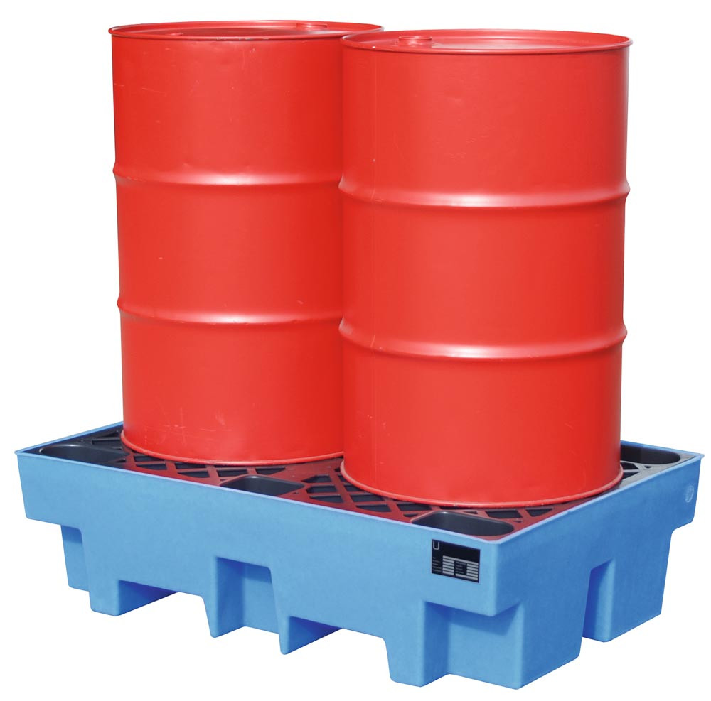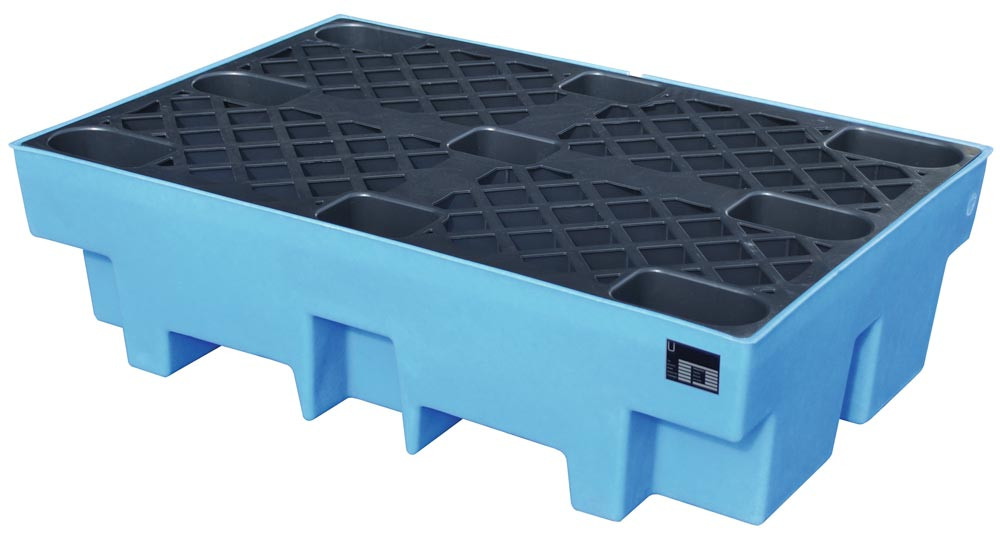 Polyethylen-Auffangwanne mit Einfahrtaschen und PE-Palette, BxTxH 830x1230x330 mm, blau, Auffangvolumen 200 l, Gewicht 18 kg, Traglast 650 kg