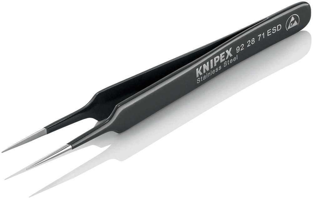 ESD-Beschichtung: blendfrei schwarz, mit einem Oberflächenwiderstand von ca. 105 Ohm · Spitzen blendfrei gebürstet · Greifflächen mattiert für optimalen Halt · Chrom-Nickel-Stahl, rostfrei, antimagnetisch (18/10)