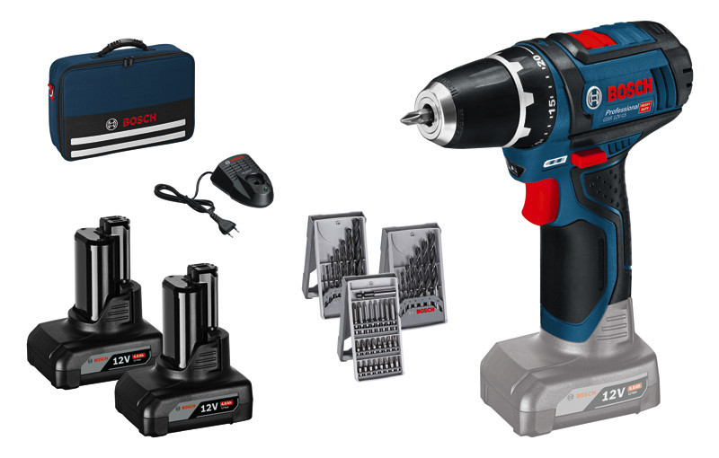 Professional-Set: Akku-Bohrschrauber GSR 12V-15 in Tasche + 39-teiliges Zubehör in Handwerkertasche. Mehr Schraubpower mehr Zubehör!. Schnellladegerät GAL 1215 CV (2 607 226 104). 2 x Akku GBA 12V 4.0Ah (1 600 Z00 02Y). 25tlg. Schrauberbit-Set (2 607 017 037). 7tlg. Metallbohrer-Set, HSS-R (2/3/4/5/6/7/8 mm) (2 607 017 036). 7tlg. Holzbohrer-Set (3/4/5/6/7/8/10 mm) (2 607 017 034). Handwerkertasche